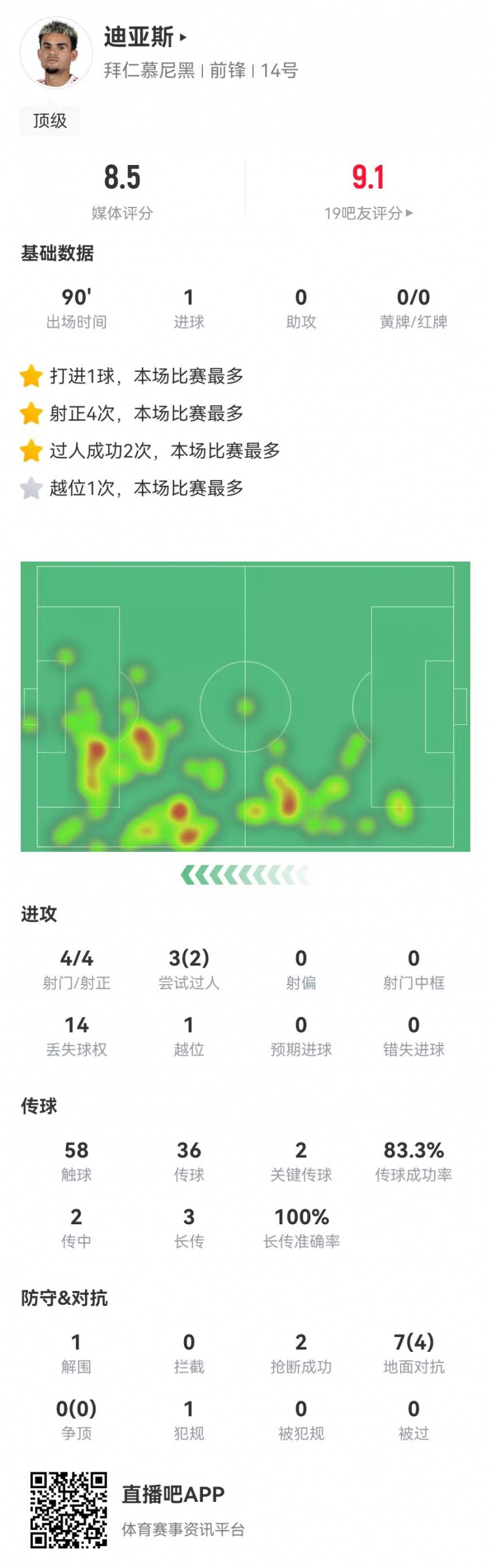 直播吧4月23日讯 拜仁在本轮德国杯半决赛2-0击败勒沃库森,迪亚斯本场数据如下: