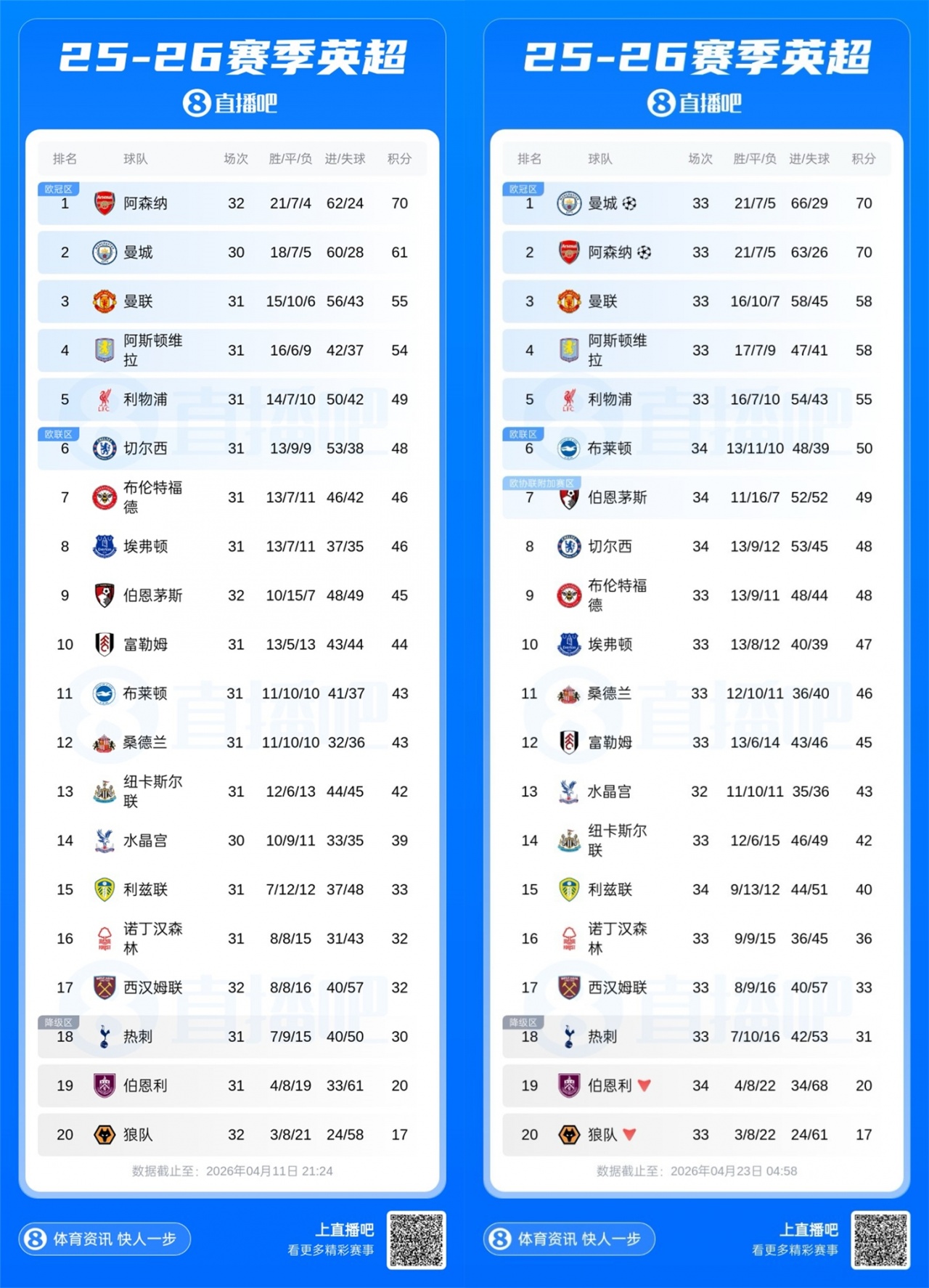 此役后,曼城积70分追平阿森纳,两队均赛33场的情况下,净胜球都是37个,曼城进球数66,阿森纳进球数63,因此曼城登顶!
